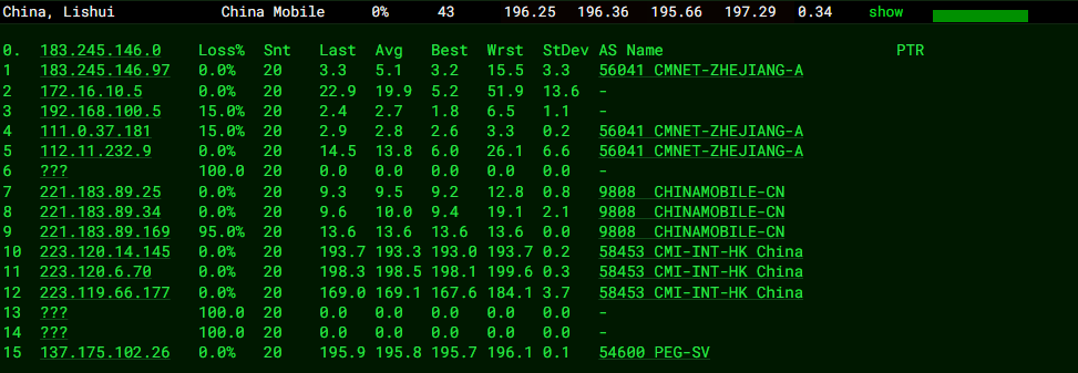 3.4.1 ping.pe 国内移动节点去程 MTR如下图