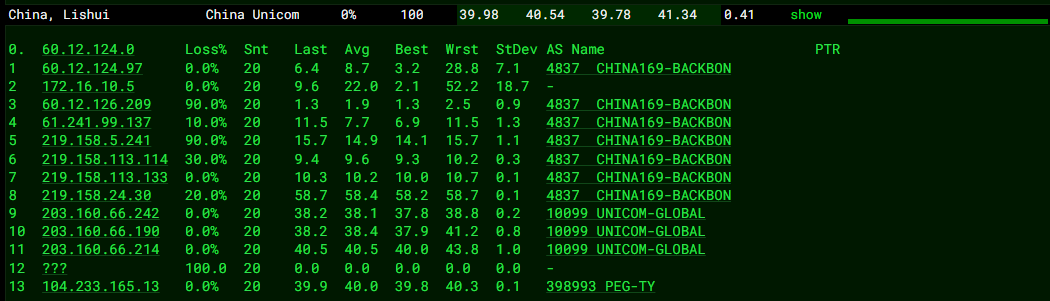 3.3.1 ping.pe 国内联通节点去程 MTR 如下图