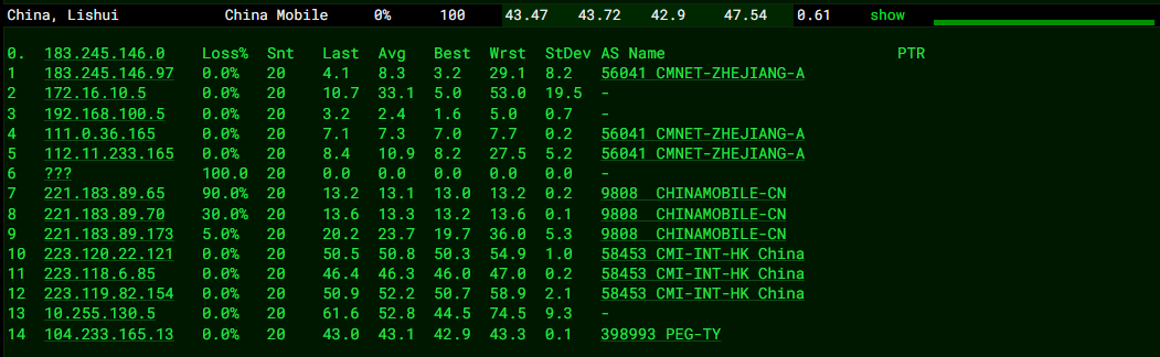 3.4.1 ping.pe 国内移动节点去程 MTR如下图