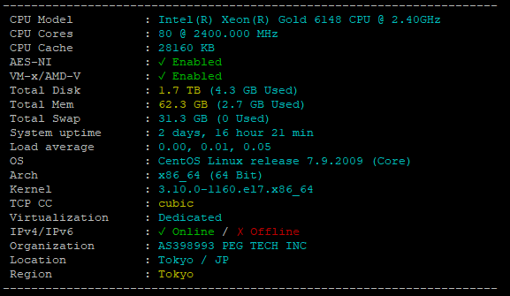 本次测试的RAKsmar东京日本物理服务器,定位为“大陆优化”线路,性能卓越。硬件上搭载双路Gold 6133 CPU、64G内存及1T NVMe系统盘,为高负载应用提供了强大的计算与IO保障。