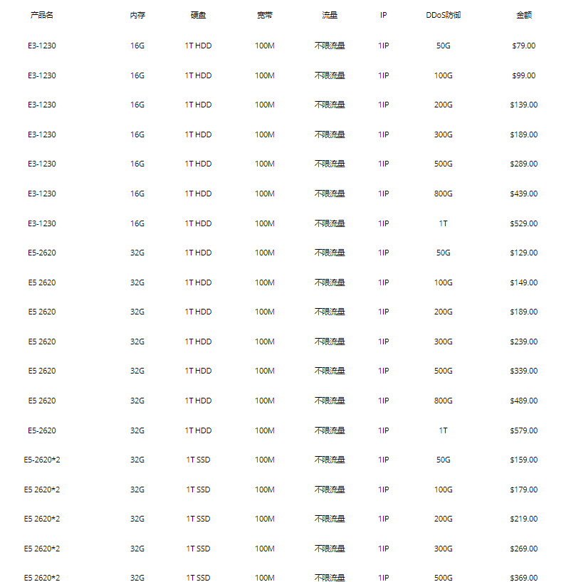 | 游戏旗舰版 | 双E5-2680 | 128GB | 2TB SSD | 1Gbps | ✓ | 100Gbps | $299/月 |