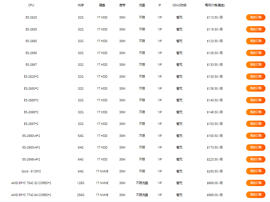 | 带宽 | 100Mbps | 500Mbps | 1Gbps | 10Gbps |