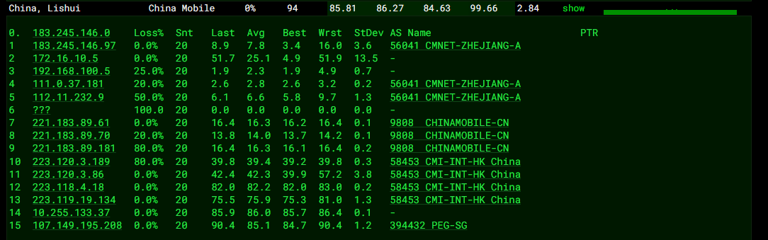 3.2.1 ping.pe 国内电信节点去程 MTR 如下图