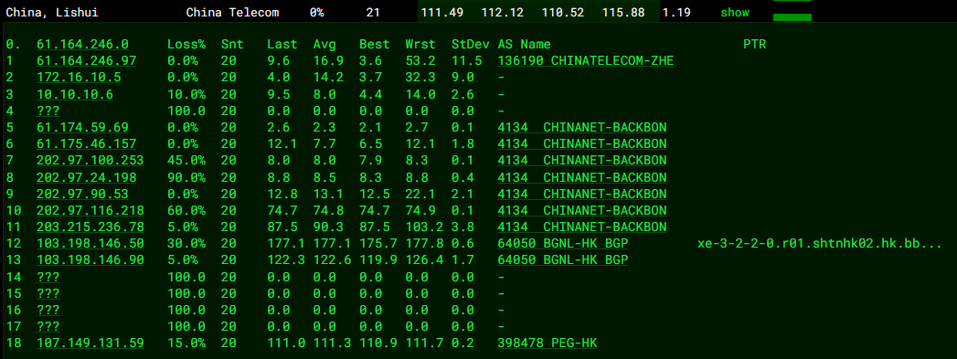 3.2.1 ping.pe 国内电信节点去程 MTR 如下图