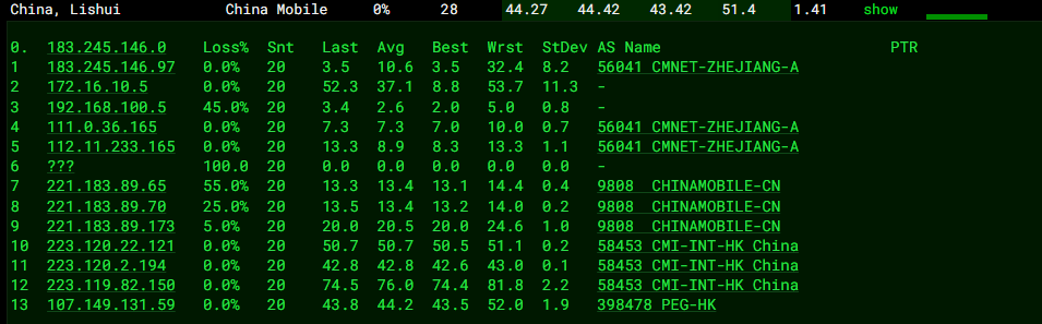 3.4.1 ping.pe 国内移动节点去程 MTR如下图
