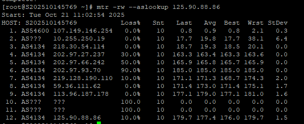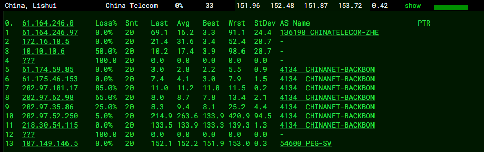 3.5 中国电信回程 MTR 测试 如下图