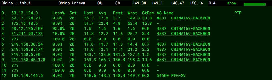 3.6 中国联通回程 MTR 测试 如下图