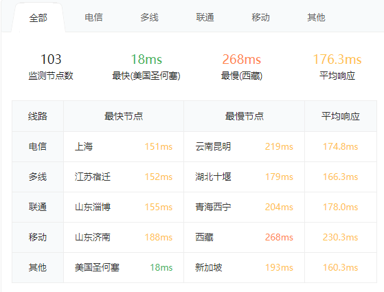 3.2 itdog 国内多点电信 Ping 如下图