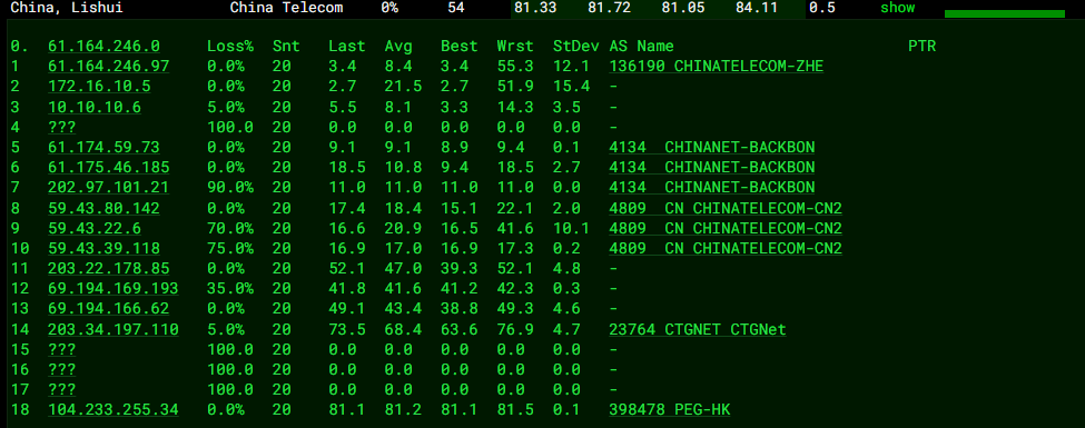 3.2.1 ping.pe 国内电信节点去程 MTR 如下图