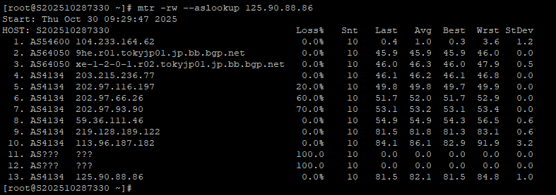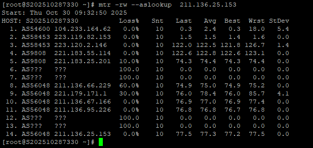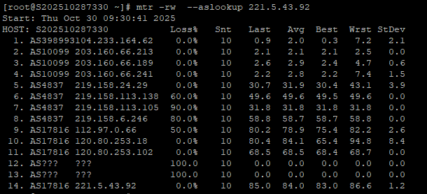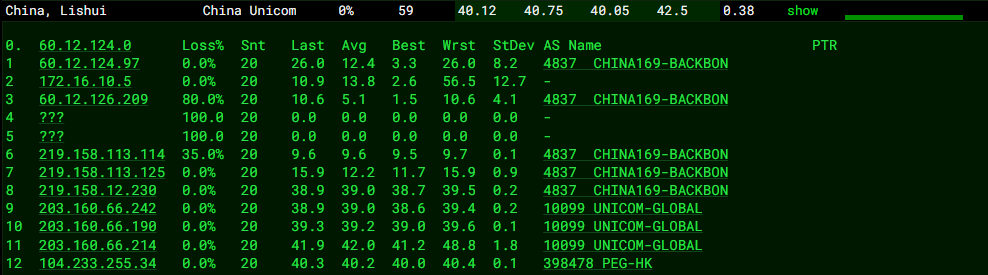 3.3.1 ping.pe 国内联通节点去程 MTR 如下图