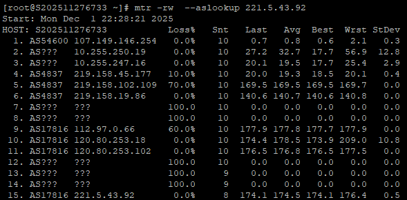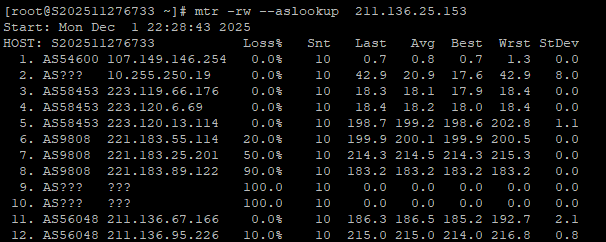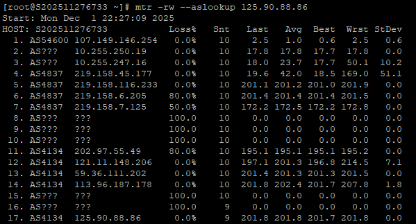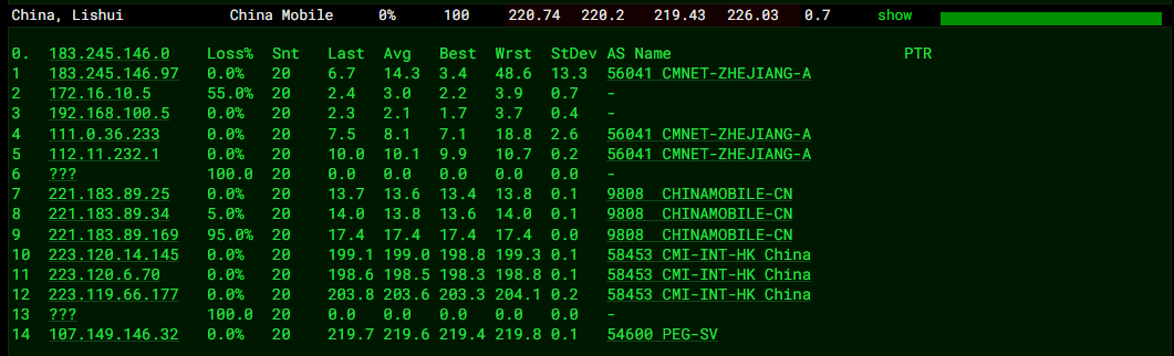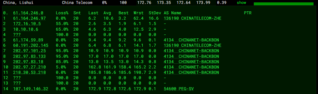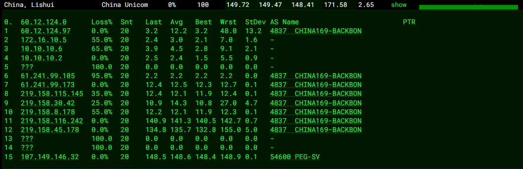 中国电信回程、中国联通回程、中国移动回程 MTR 测试 如下图