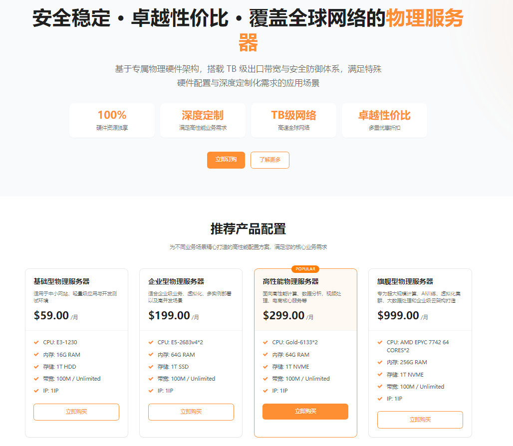 性能独占性:物理服务器提供完整的硬件资源独占,无“邻居效应”干扰,特别适合高负载应用